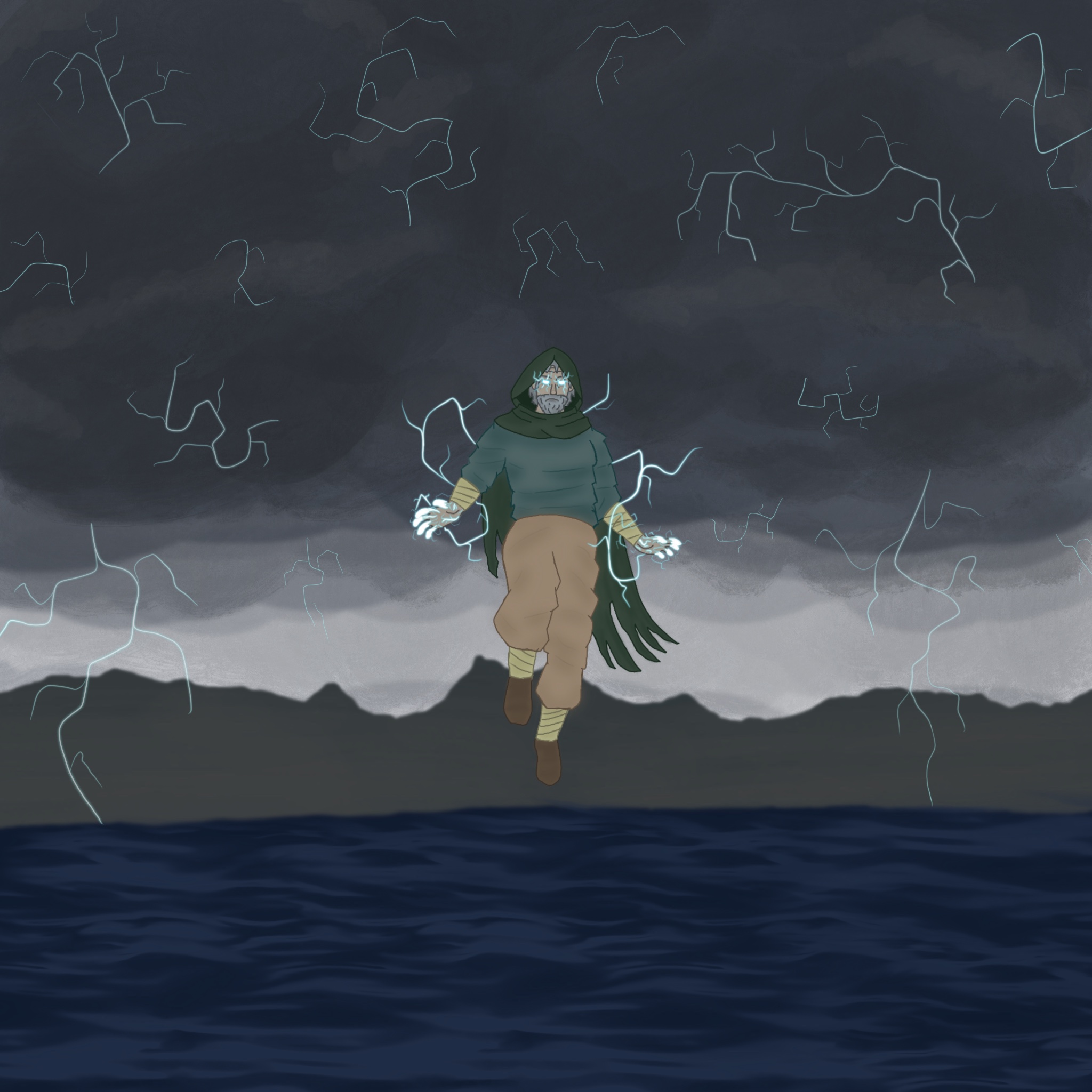 The Vagrant, like a storm, is always moving. The penultimate child of the star-gods, The Vagrant was the first to leave Mount Psilas and venture forth into the world. The Vagrant does not spend most of their time on Mount Psilas, or with mortals, or in the sky, or on the sea, but on the road. The Vagrant's time is spent walking, flying, moving, and traveling, never staying in one place for too long. Disguised, they will travel to villages and cities across Latis, meeting locals and interacting with people of all sorts, but only for a short time. However, The Vagrant often brings storms after they visit, feared and respected by mortals for its life-giving rain and life-taking lightning.