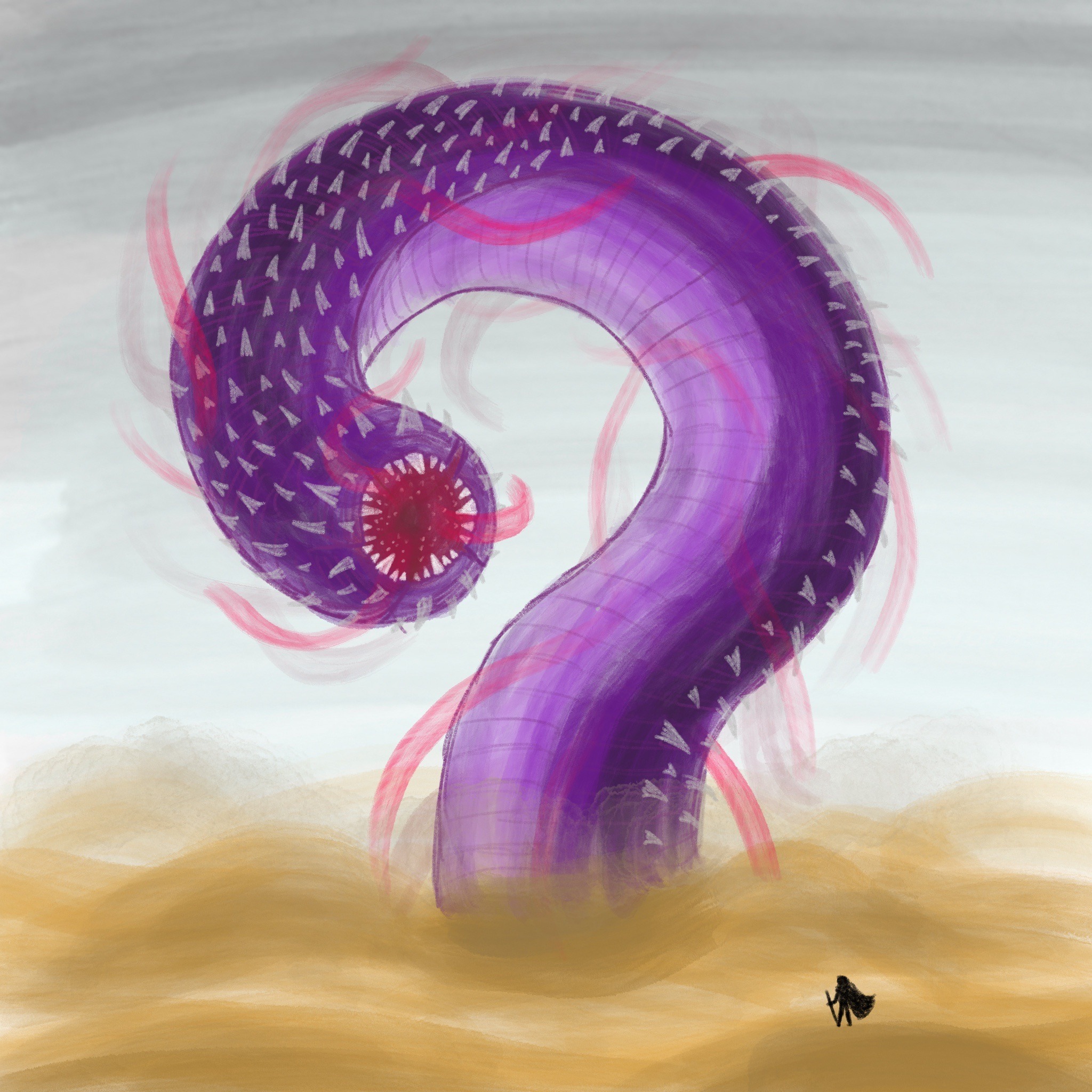 Skolysmos is a living wrath within the sands of Lutis, writhing its way under the dunes, causing calamity wherever it goes. whenever it takes damage, more giant purple worms grow from the blood, but none can match Skolysmos' sheer size, strength, or wrath. The living titan can be identified by its ability to create whirlpools within the sand, where many find their demise.